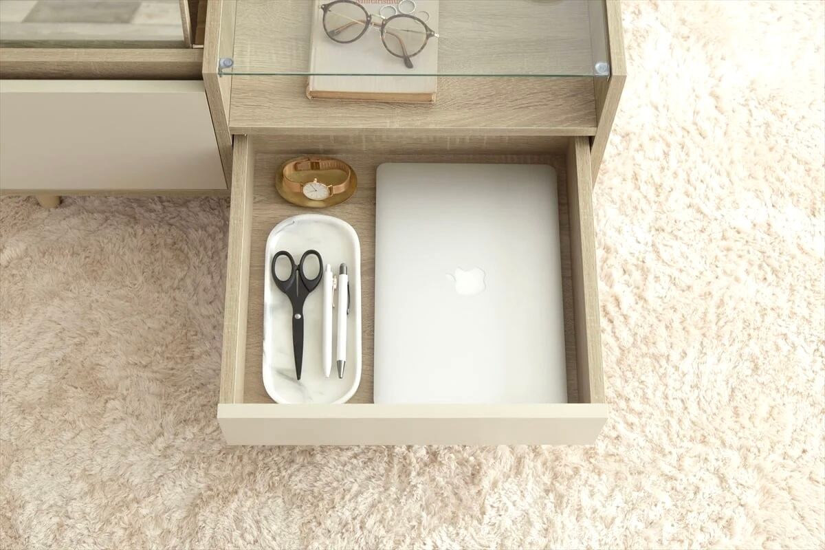 木目とホワイトのバイカラーが印象的な『Erin(エリン)』シリーズのディスプレイ収納付きドレッサーテーブル