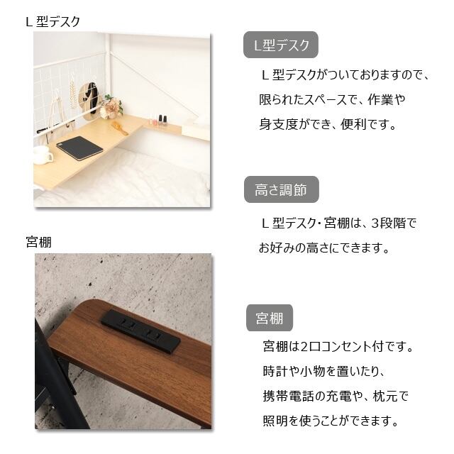◆L型デスク・宮棚は、3段階でお好みの高さに調節できます。