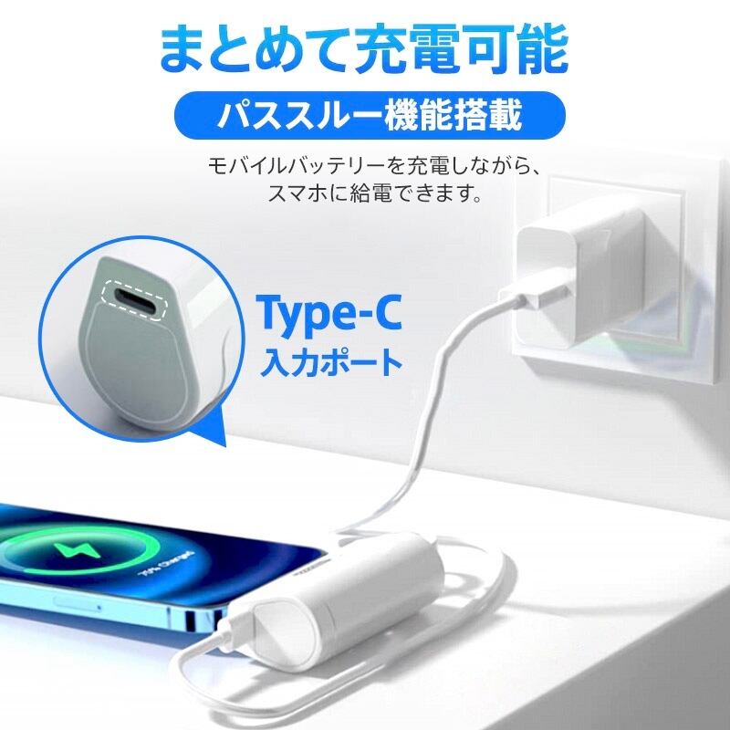 モバイルバッテリー 大容量 超軽量 5000mAh iphone用 2台同時充電 ケーブル内蔵 Type-C Lightning
