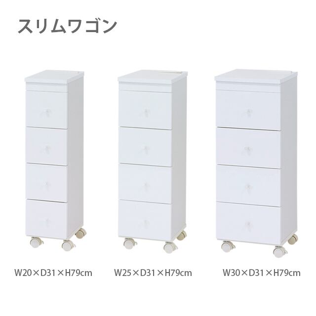 スリムワゴンは、窮屈なスペースでも使いやすいコンパクトなデザインが特徴です。幅20cm、幅25cm、幅30cmの3タイプからお選びいただけます。狭いキッチンやトイレ、洗面所など、限られたスペースにもスッキリと収まります。