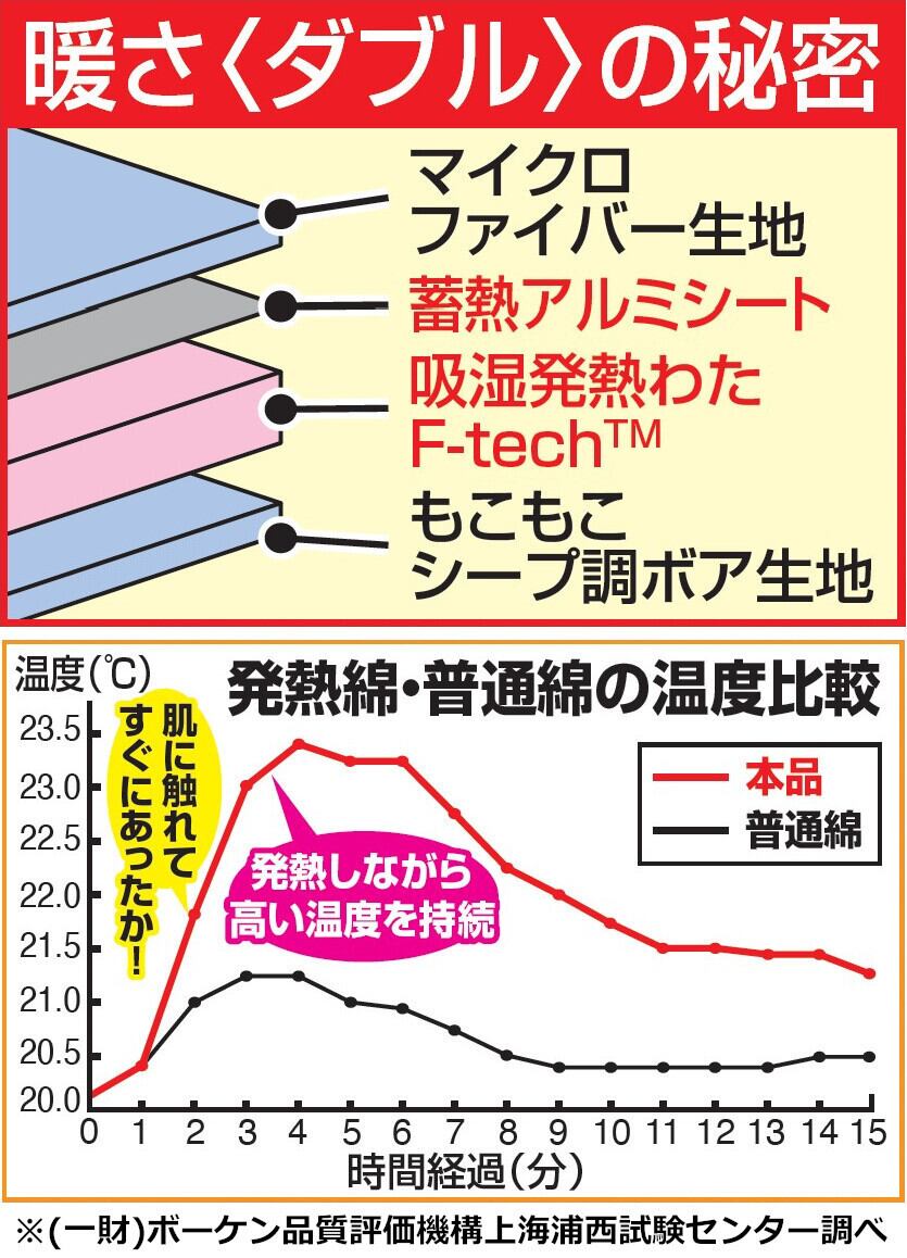 ●素材/表生地:ポリエステル100%(マイクロファイバー)、裏生地:ポリエステル100%(シープボア)、中綿:ポリエステル70%・レーヨン30%(吸湿発熱)・アルミ蒸着シート